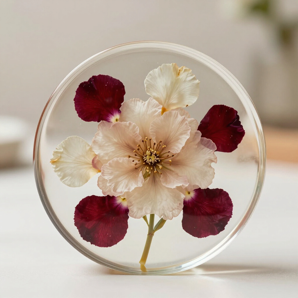 Our artists thoughtfully arrange your flowers into a custom design. We then pour multiple layers of UV-resistant, jewelry-grade resin to encapsulate your memories in a clear, timeless form.
